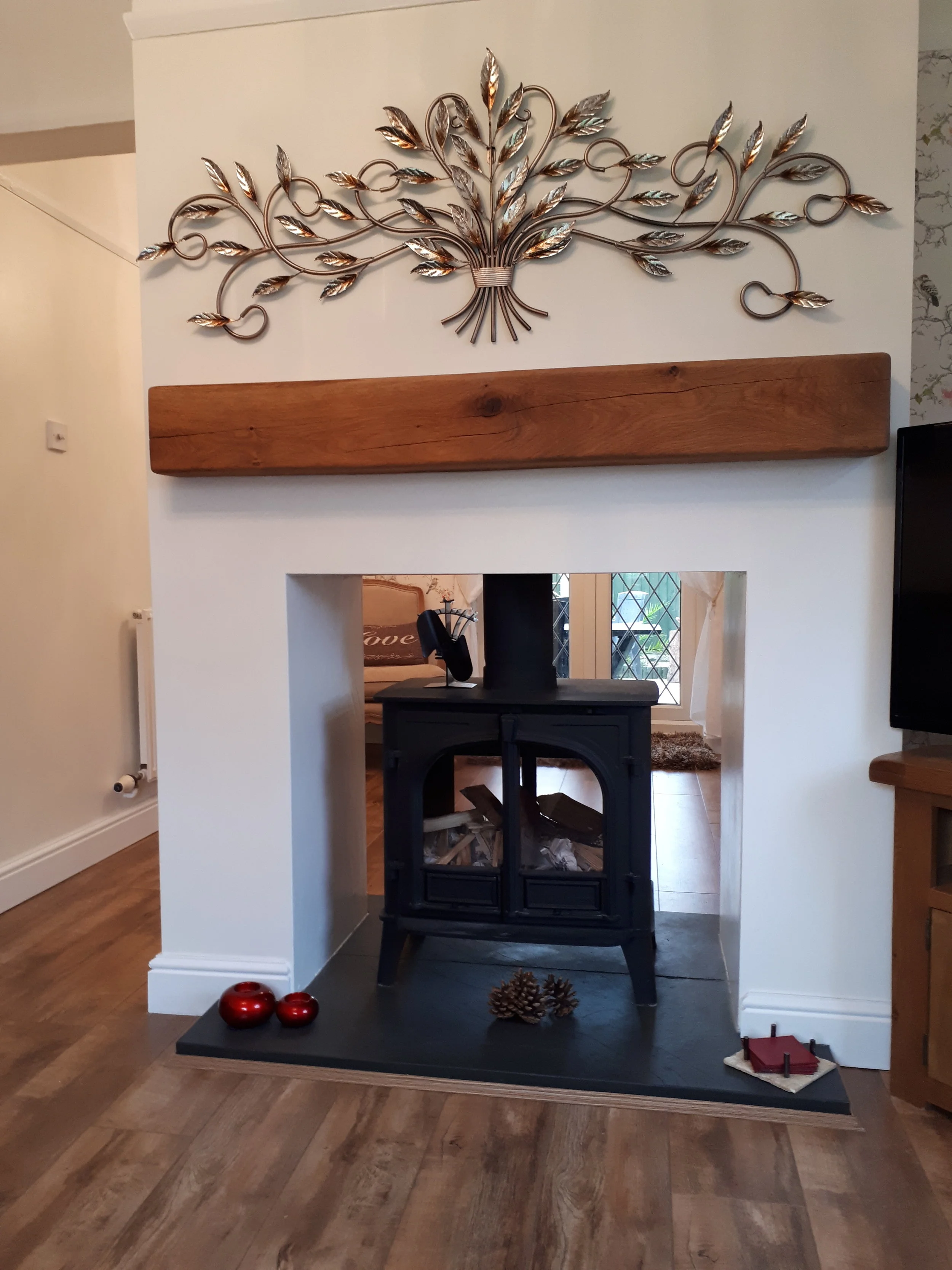 Front living room view of a doublesided hunter multi-fuel stove with oak mantle and black slate hearth with plastered finish to cheeks of the chamber