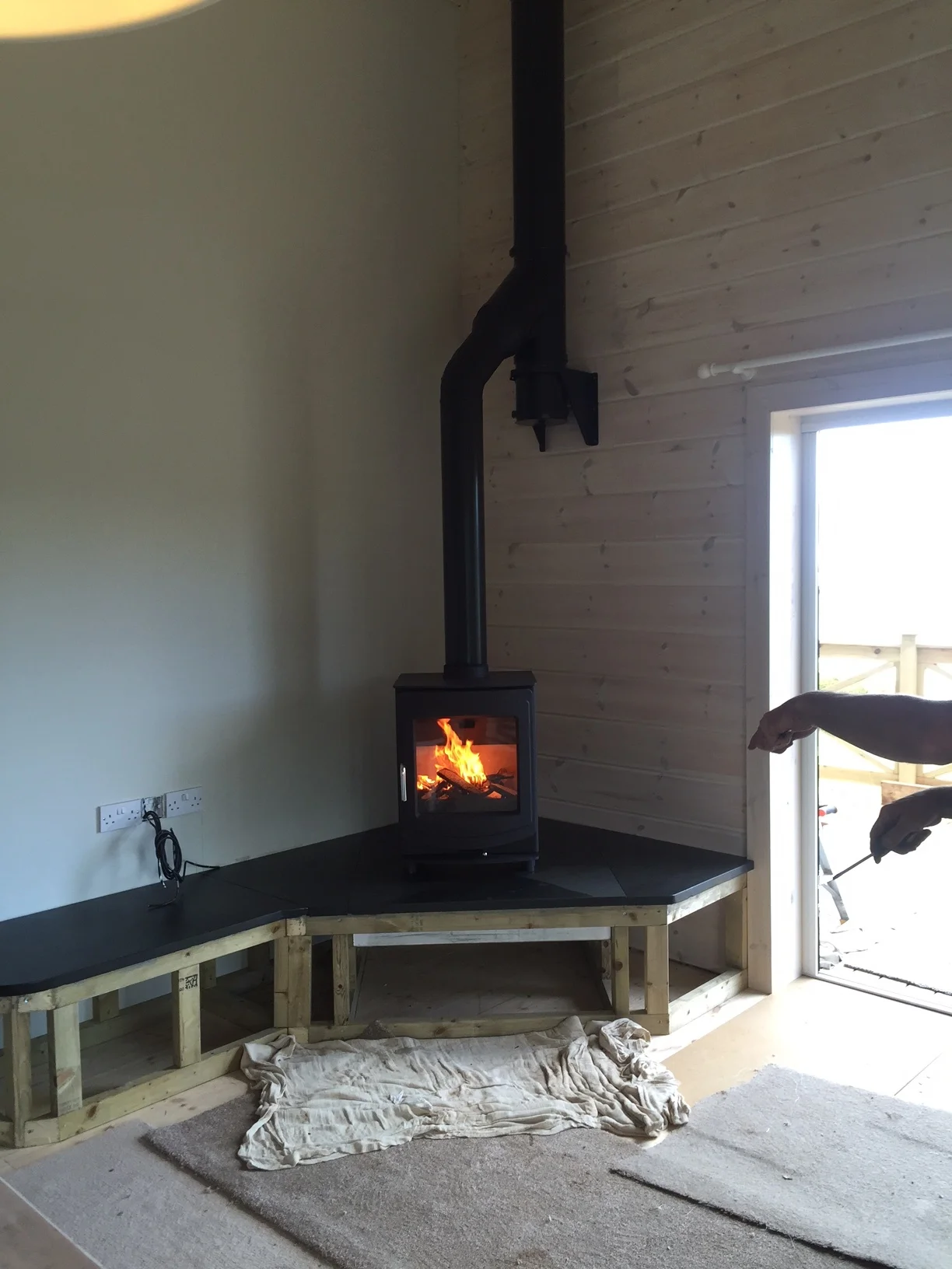 freestanding multi-fuel stove installed in a log cabin using twin wall flue system with 30mm black slate shaped hearth and glass heat shield surround
