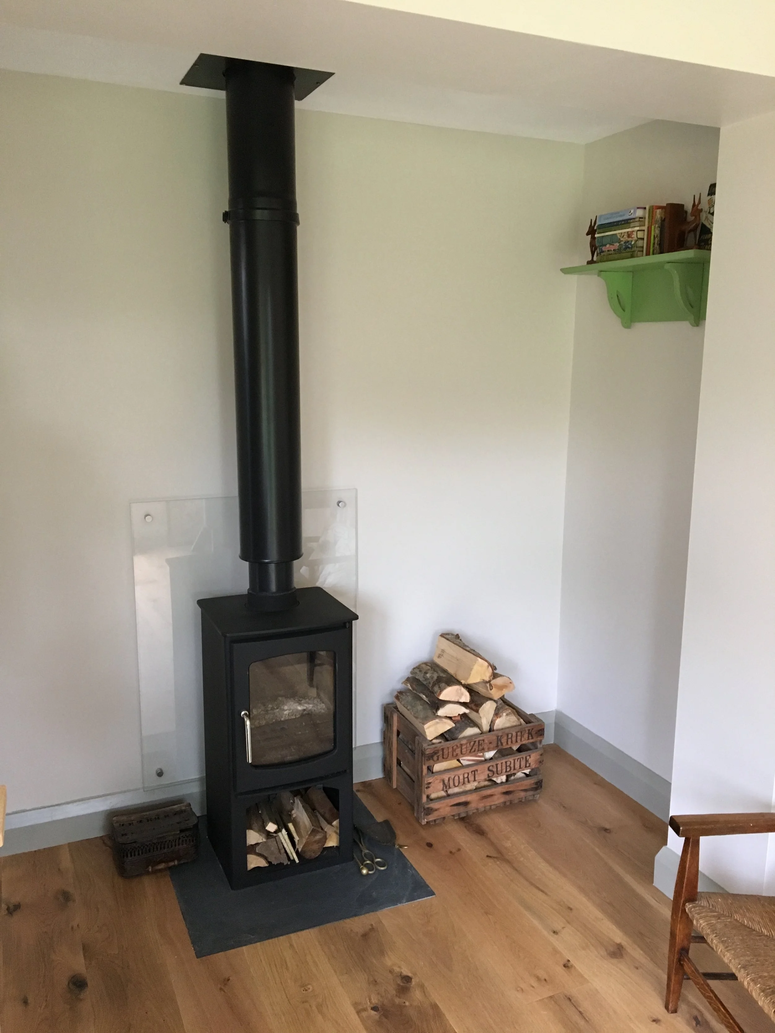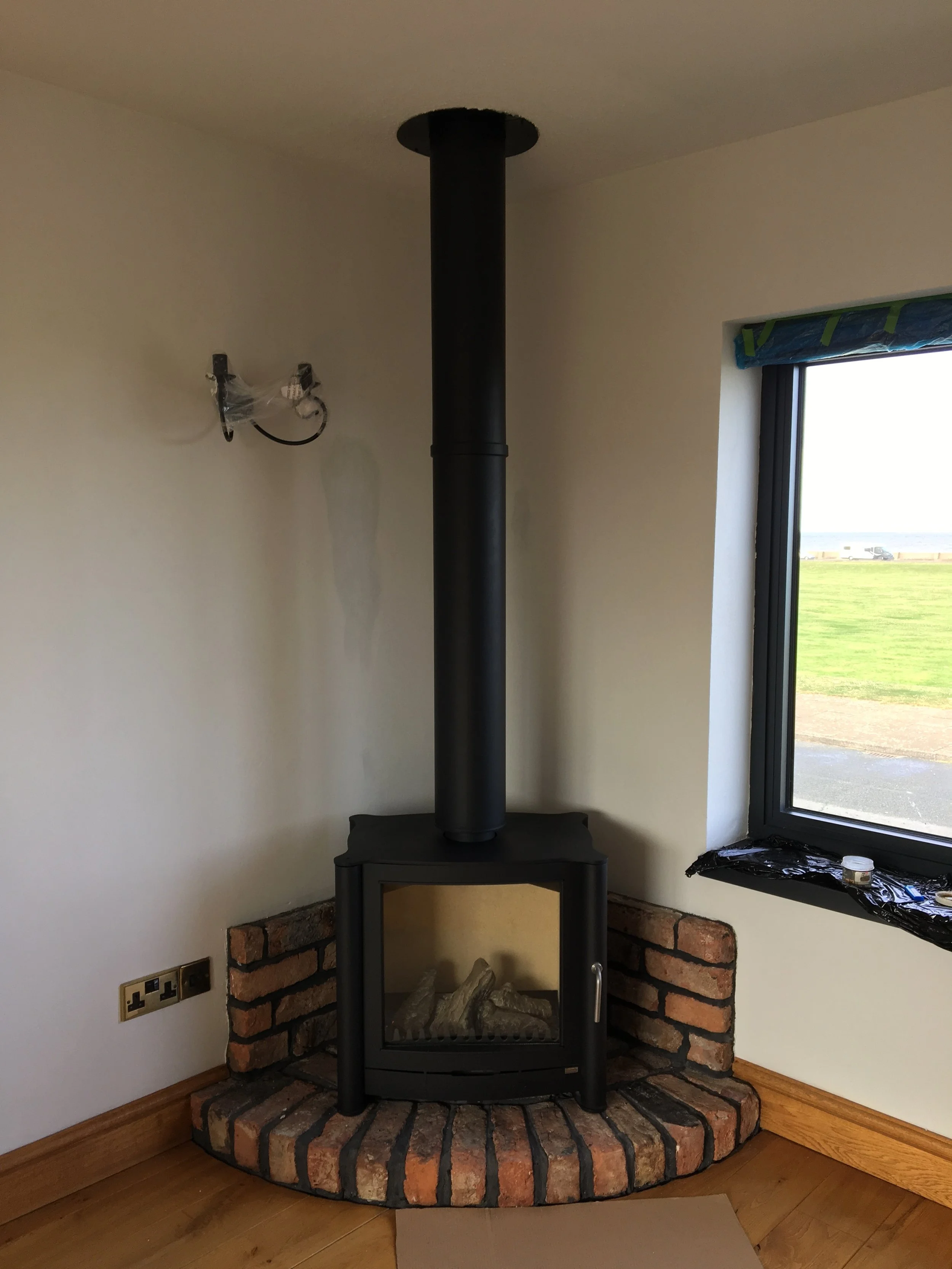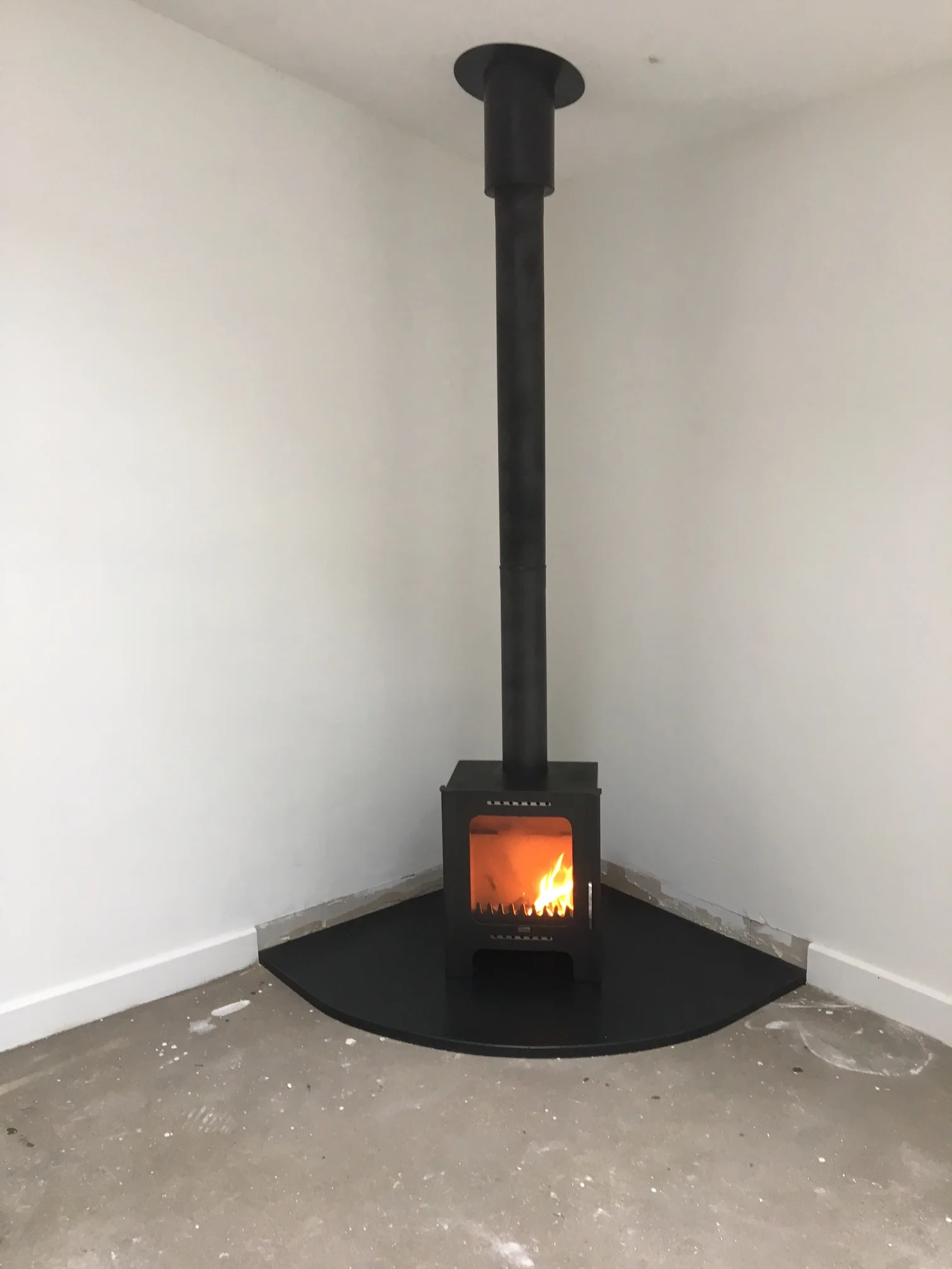 FREESTANDING MULTI-FUEL STOVE INSTALLED USING TWIN WALL FLUE SYSTEM WITH BLACK SLATE HEARTH