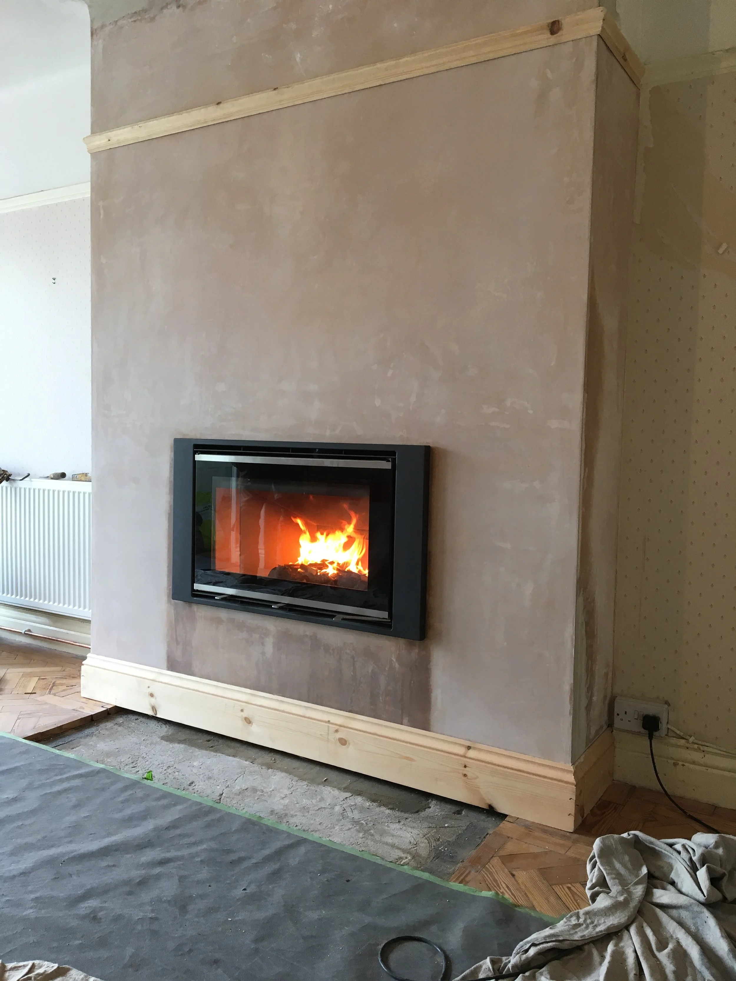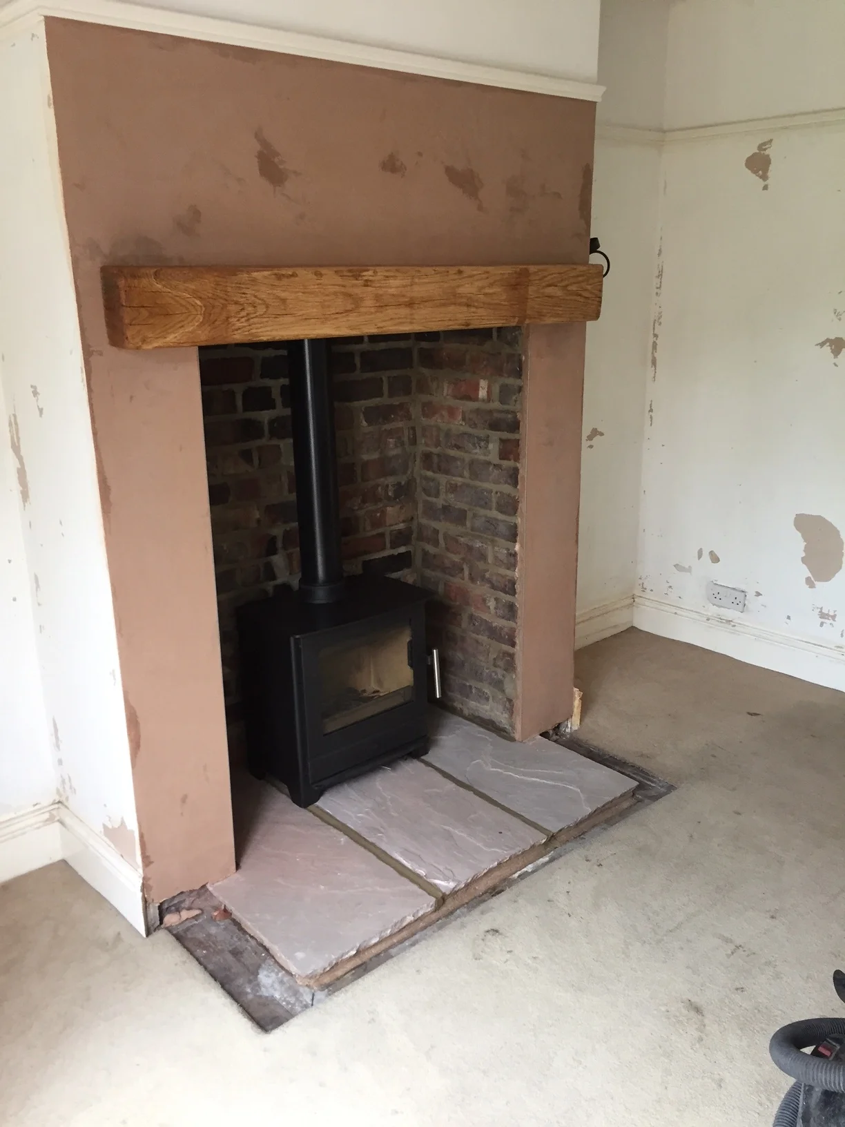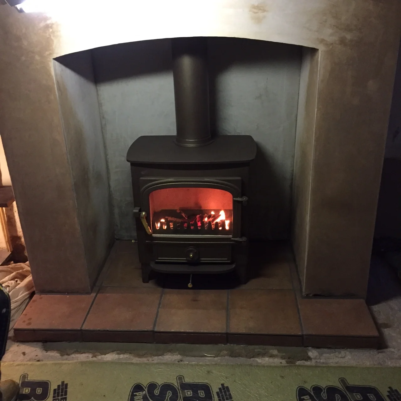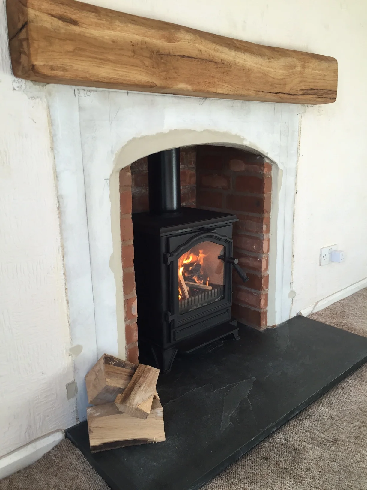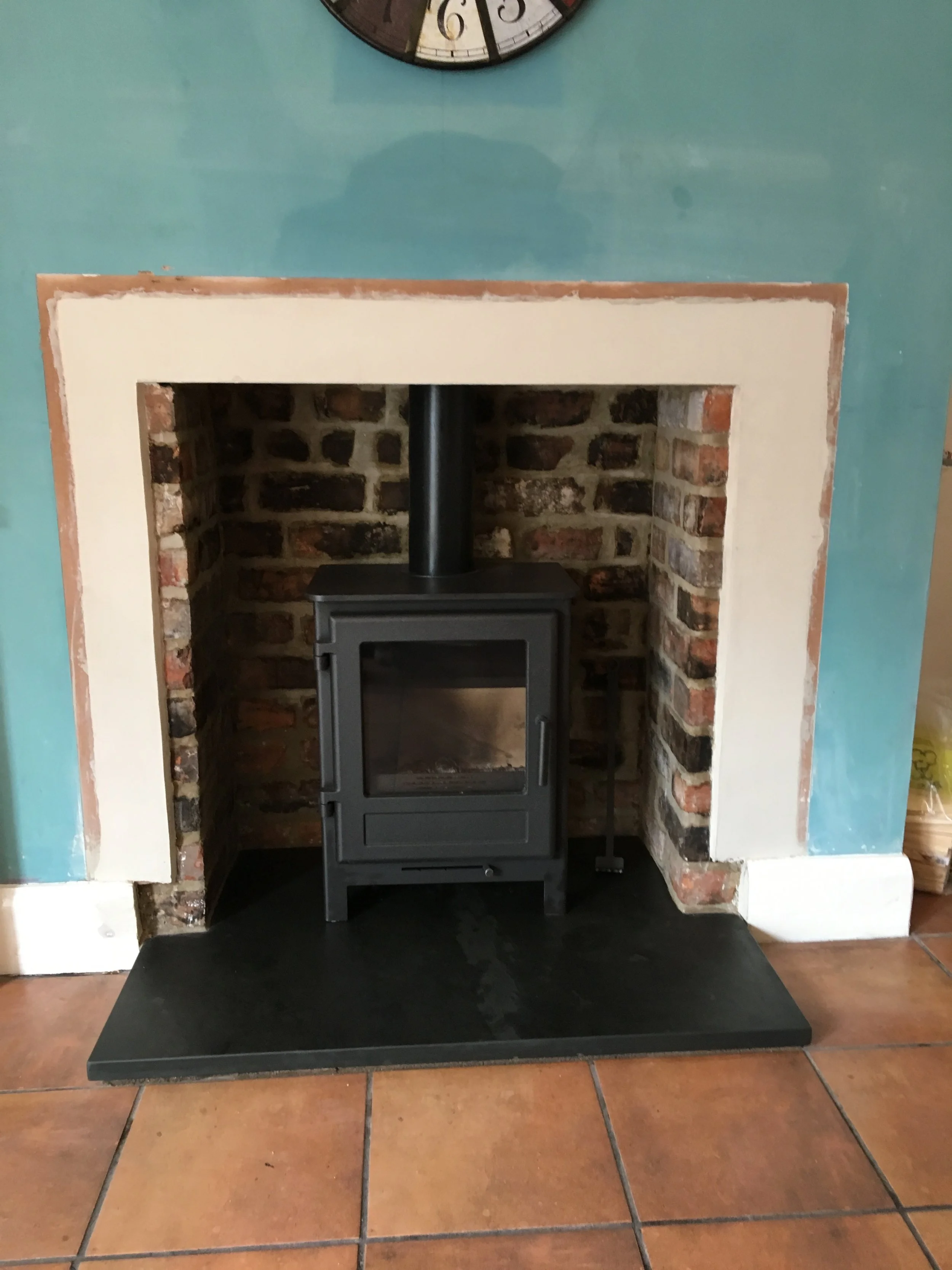 Clearview gunmetal multi-fuel stove using existing brick arch, with tiled hearth and plastered finish inside and around the chamber