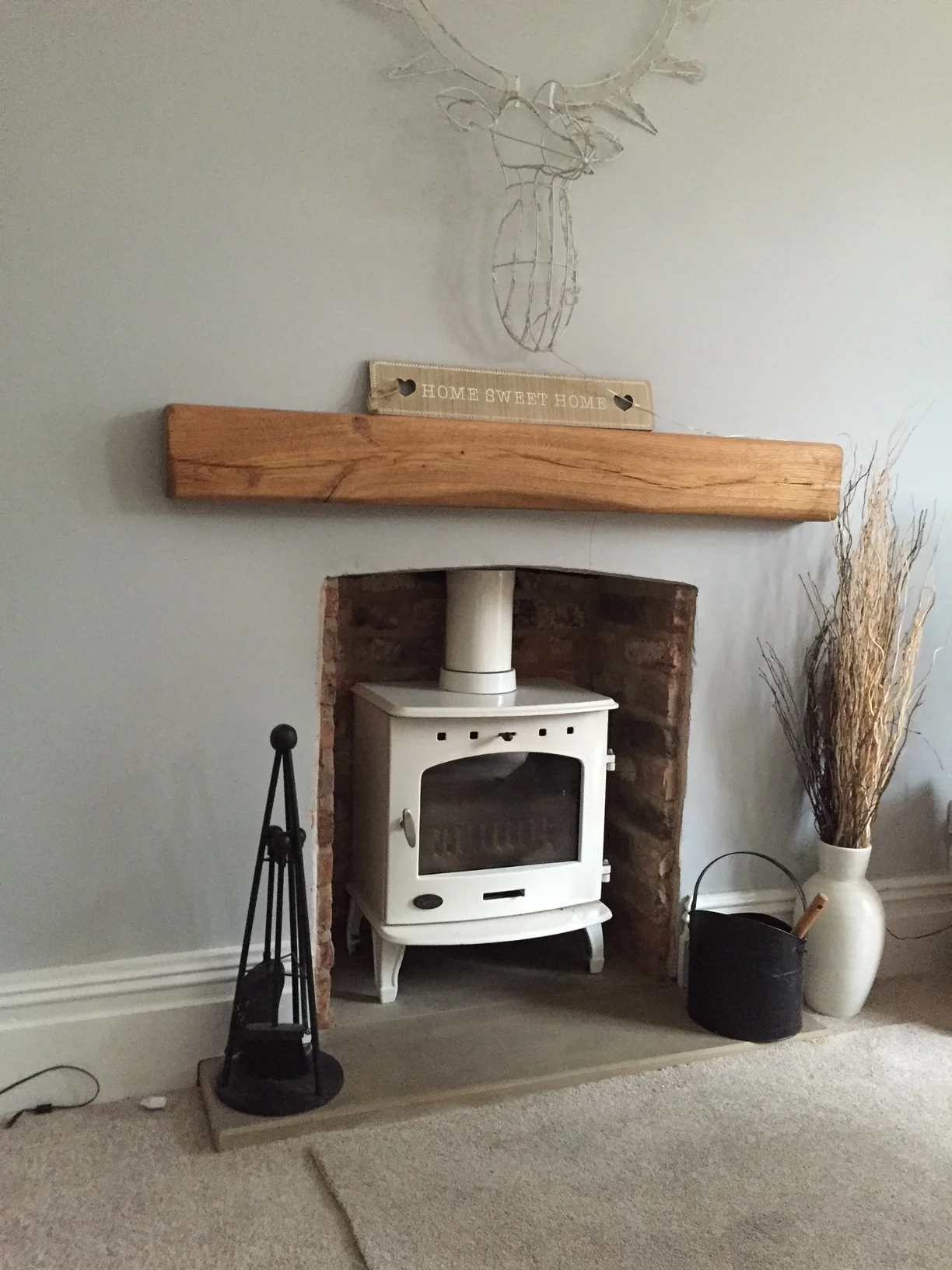 A white Charnock multi-fuel stove with a stone hearth, Weathered oak mantle and brick finish inside the chamber